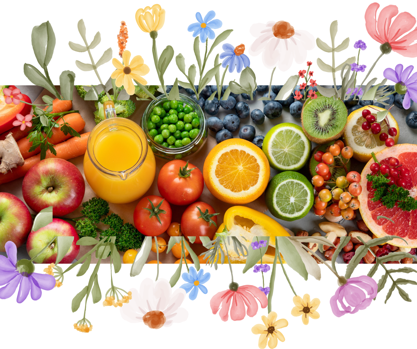 Lebensmitteln wie buntem Gemüse, ausgereiftem Obst, hochwertigen